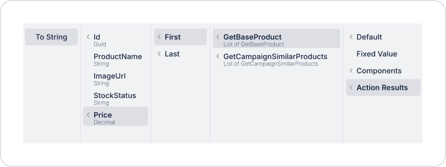 Alt kenardaki ilk Label elementine tıklayın. Label > Properties > Value > Action Results > GetBaseProduct > First > Price olarak ayarlayın.