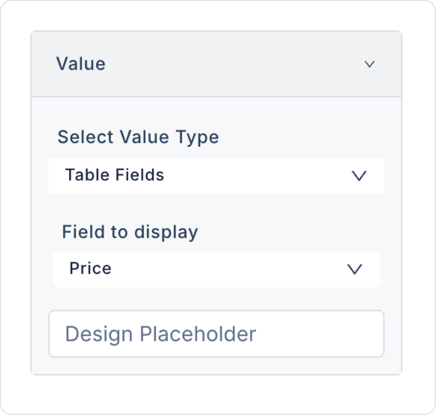 Alt kısımdaki ilk Label Elementine tıklayın. Label > Properties > Value > Field to display > Price olarak ayarlayın.