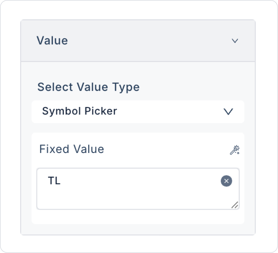 Ardından Label > Properties > Value > Select Value Type > Symbol Picker > Fixed Value adımlarını izleyerek değeri TL olarak ayarlayın.