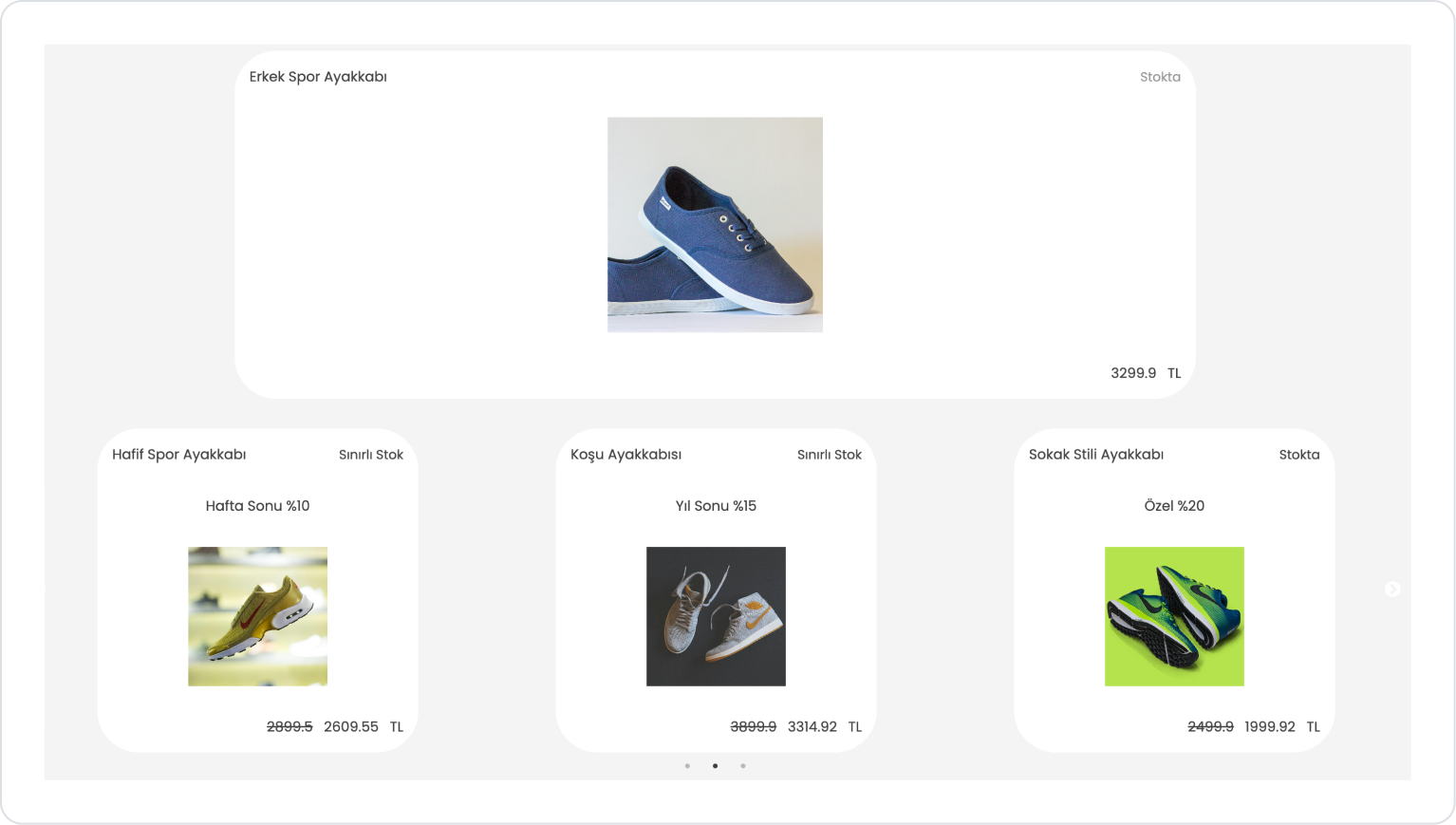 Kullanıcı, farklı ayakkabı modellerini aynı ekranda inceleyebilir; kampanyalı ürünleri, indirim oranlarını ve stok bilgilerini kolayca karşılaştırabilir. Bu yapı sayesinde ürünler hem odaklı hem de karşılaştırılabilir bir düzende sunularak kullanıcı deneyimi güçlendirilir.