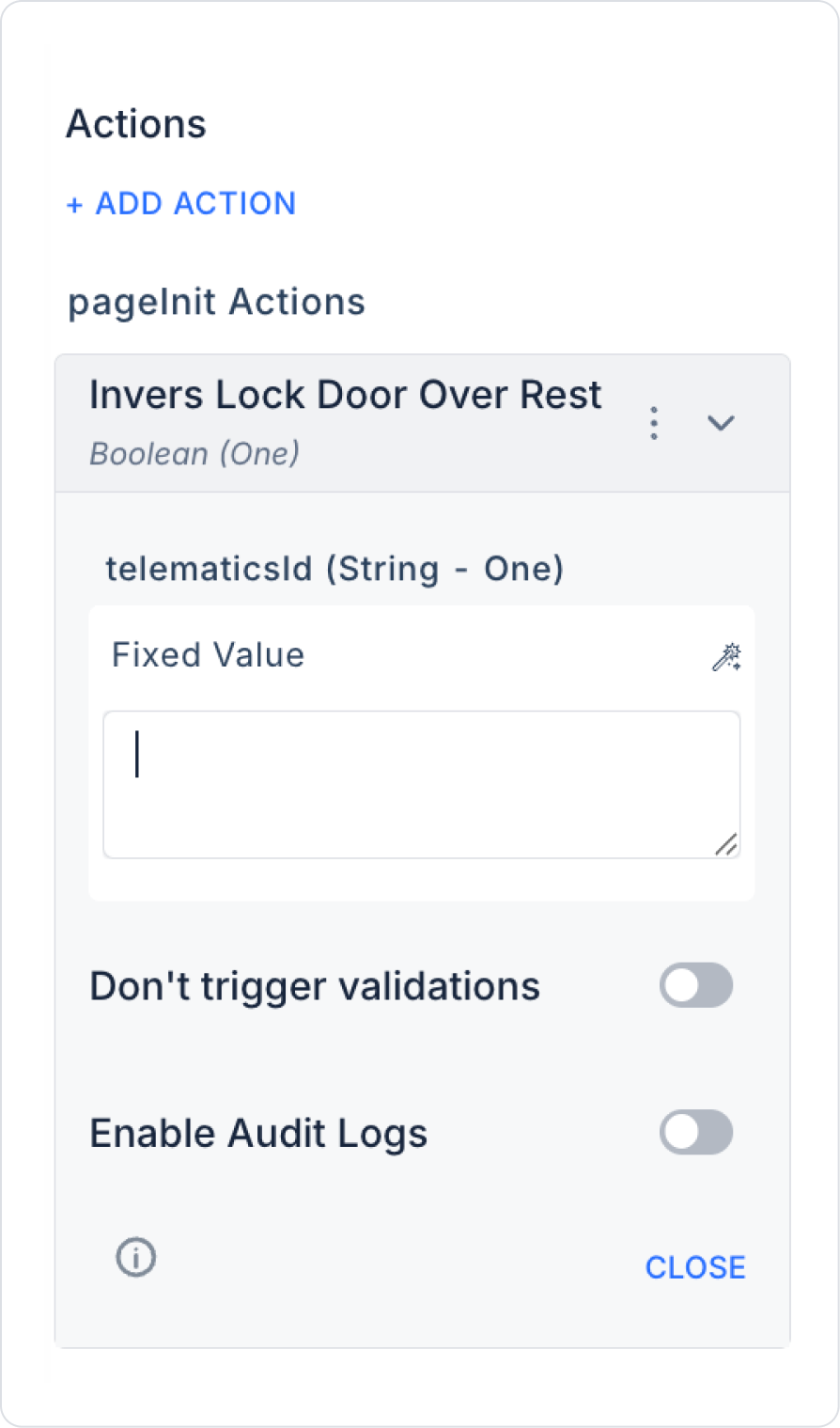 Kuika’nın Invers Lock Door Over Rest aksiyonu, RESTful API kullanarak aracınızın kapılarını uzaktan kilitlemenizi sağlar. Bu aksiyon, internet bağlantısı üzerinden mobil veya web uygulamanız aracılığıyla kapı kilitlerini güvenli ve hızlı şekilde kontrol etmenize olanak tanır.