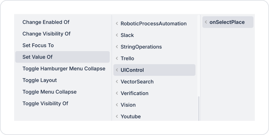 Arama sonucunda seçilen lokasyonun haritada işaretlenmesi için LocationSearch > Properties > onSelectPlace > UIControl > Set Value Of aksiyonunu ekleyin.