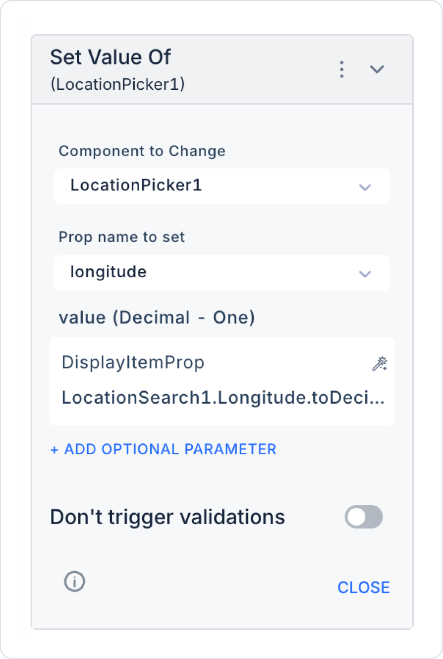 Set Value Of aksiyonu içerisinde Component to Change > LocationPicker1, Prop name to set > longitude ve value > Components > LocationSearch > Longitude > To Decimal tanımlamalarını yapın.