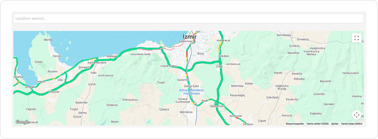 Location Search elementi; harita etkileşimi gerektirmeden konum bulmayı mümkün kılar. Özellikle adres, şehir, semt veya mekan ismiyle arama yapılması gereken senaryolarda hızlı ve kullanıcı dostu bir çözüm sunar.