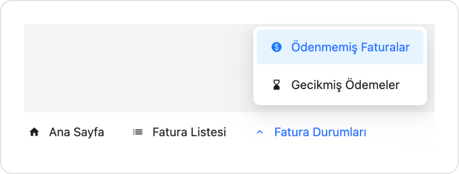 Kullanıcı, seçtiği alt menü öğesine tıkladığında ilgili fatura durumuna ait sayfaya yönlendirilir ve yalnızca seçilen duruma ait faturaları görüntüler. Bu yapı sayesinde kullanıcı, farklı sayfalardan fatura durumlarına hızlı ve tutarlı bir şekilde erişebilir.
