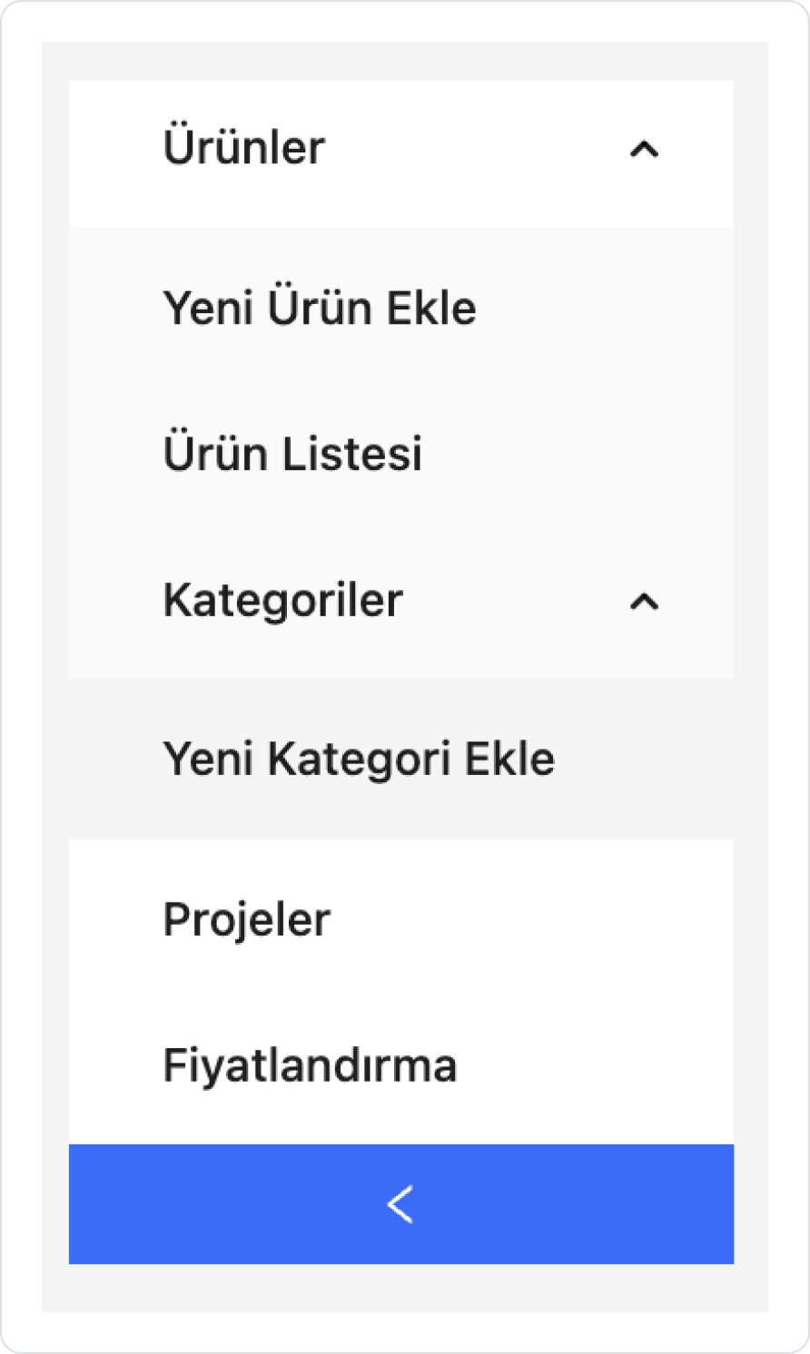 Kullanıcı “Ürünler”e tıkladığında bu alt başlıklar kolon şeklinde açılır. Başka bir başlığa geçildiğinde (örn. “Siparişler”), istenirse “Ürünler” alt başlıkları kapanacak şekilde davranış tanımlanabilir.