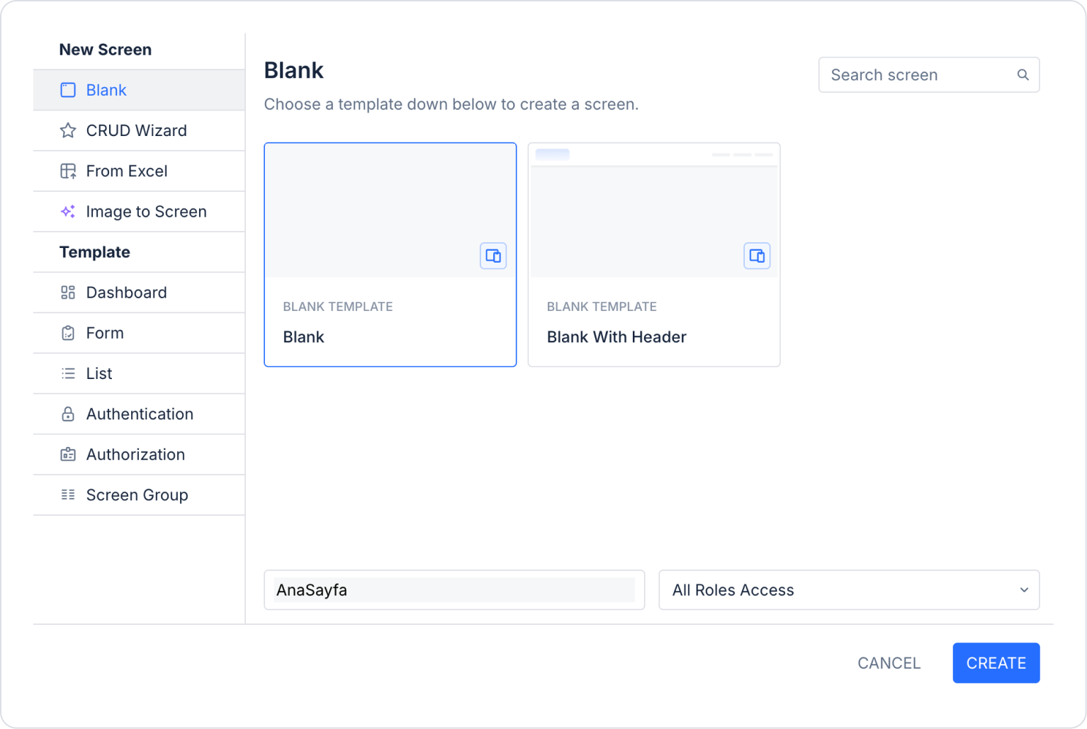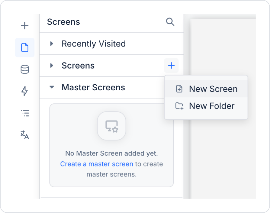 Sol yan panelde Screens bölümünden “FaturaListesi“ ve “OdenmemisFaturalar” adında yeni sayfalar oluşturun.