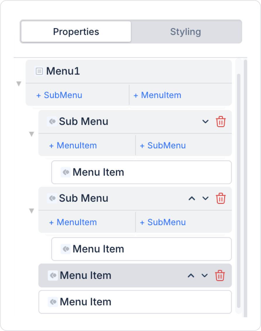 Sub Menu Ekleyin: Properties panelinde, + Sub Menu butonuna tıklayarak bir ana menü başlığı ekleyin. Bu öğe, alt menülerin bağlı olacağı başlık görevini görür.