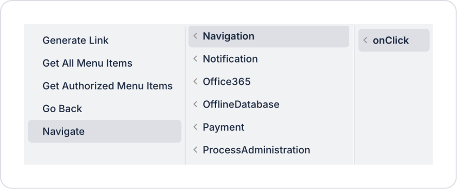 Menu elementi, kullanıcı menüde farklı bir öğe seçtiğinde tetiklenen onChange olayı üzerinden aksiyonlarla ilişkilendirilebilir. Bu tetikleyici, navigasyon ve ekran bazlı akışların yönetilmesinde kullanılır.