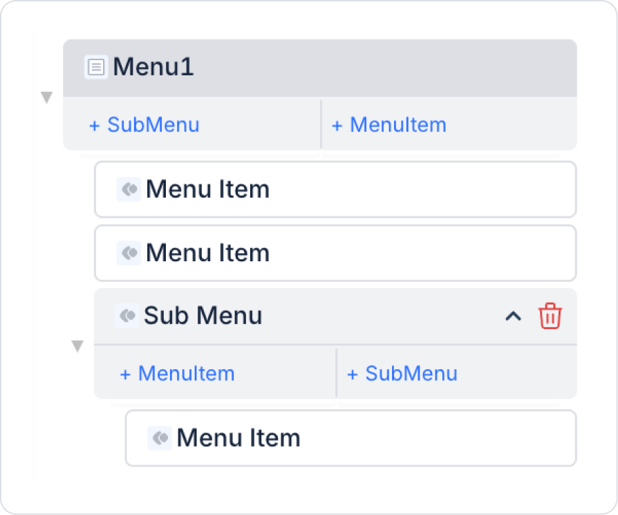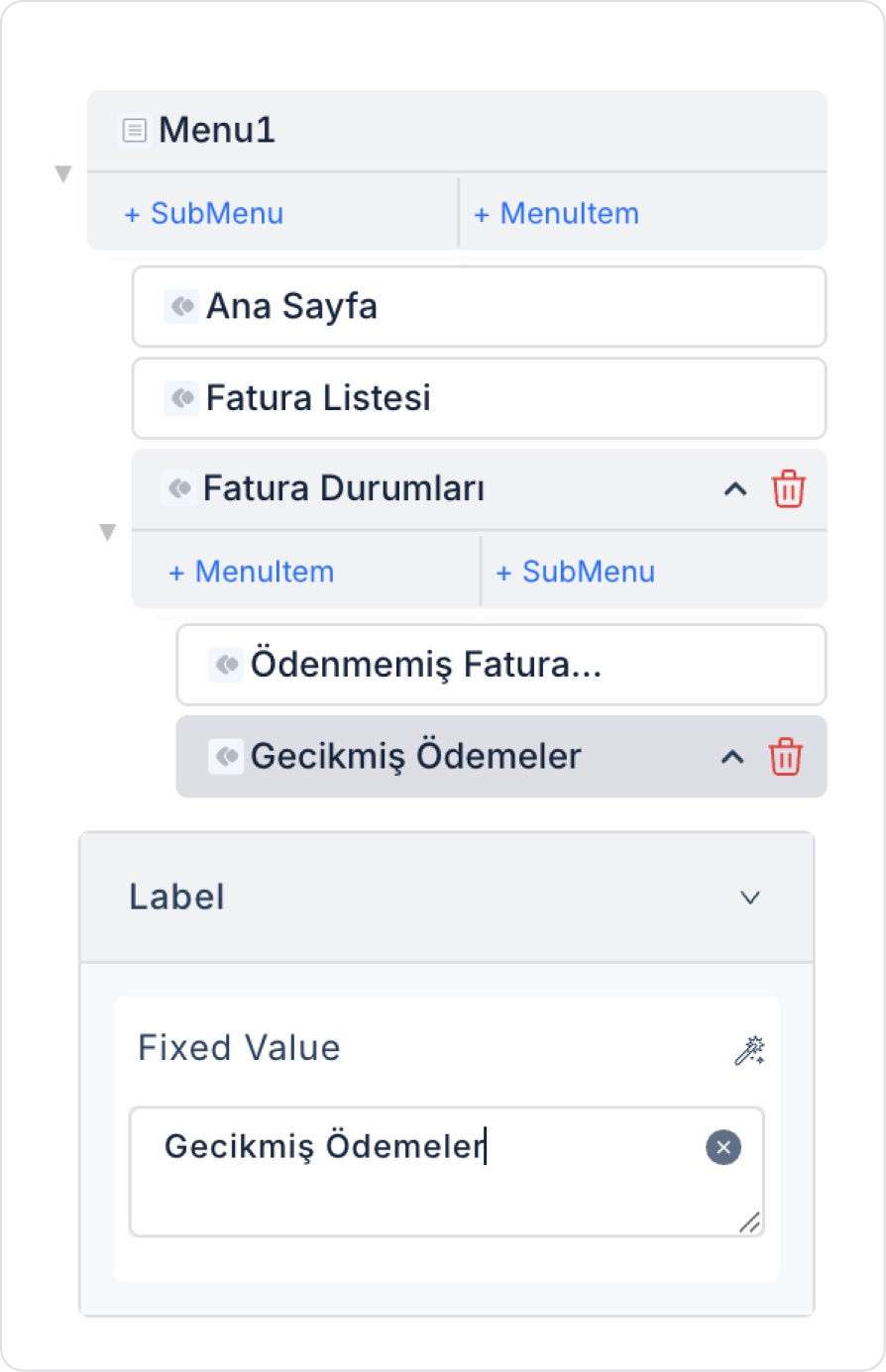 Alt Menü Öğeleri Ekleyin: Eklediğiniz Sub Menu’nün altında yer alan + Menu Item butonuna tıklayarak bir veya birden fazla alt menü öğesi oluşturabilirsiniz. Her Menu Item, kullanıcıyı farklı bir ekran ya da işlem sayfasına yönlendirebilir.