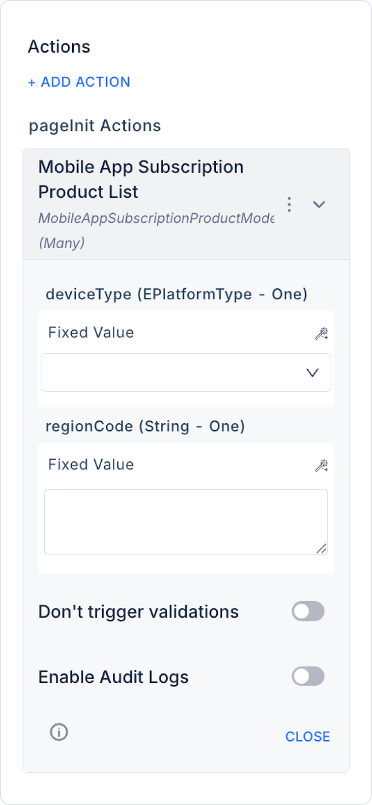 İlgili elementi seçin ve + ADD ACTION menüsünden, kullanılacak tetikleyici olaya göre Device → Mobile App Subscription Product List aksiyonunu ekleyin.
