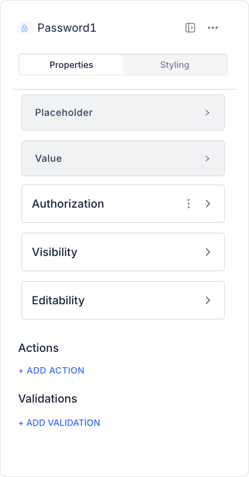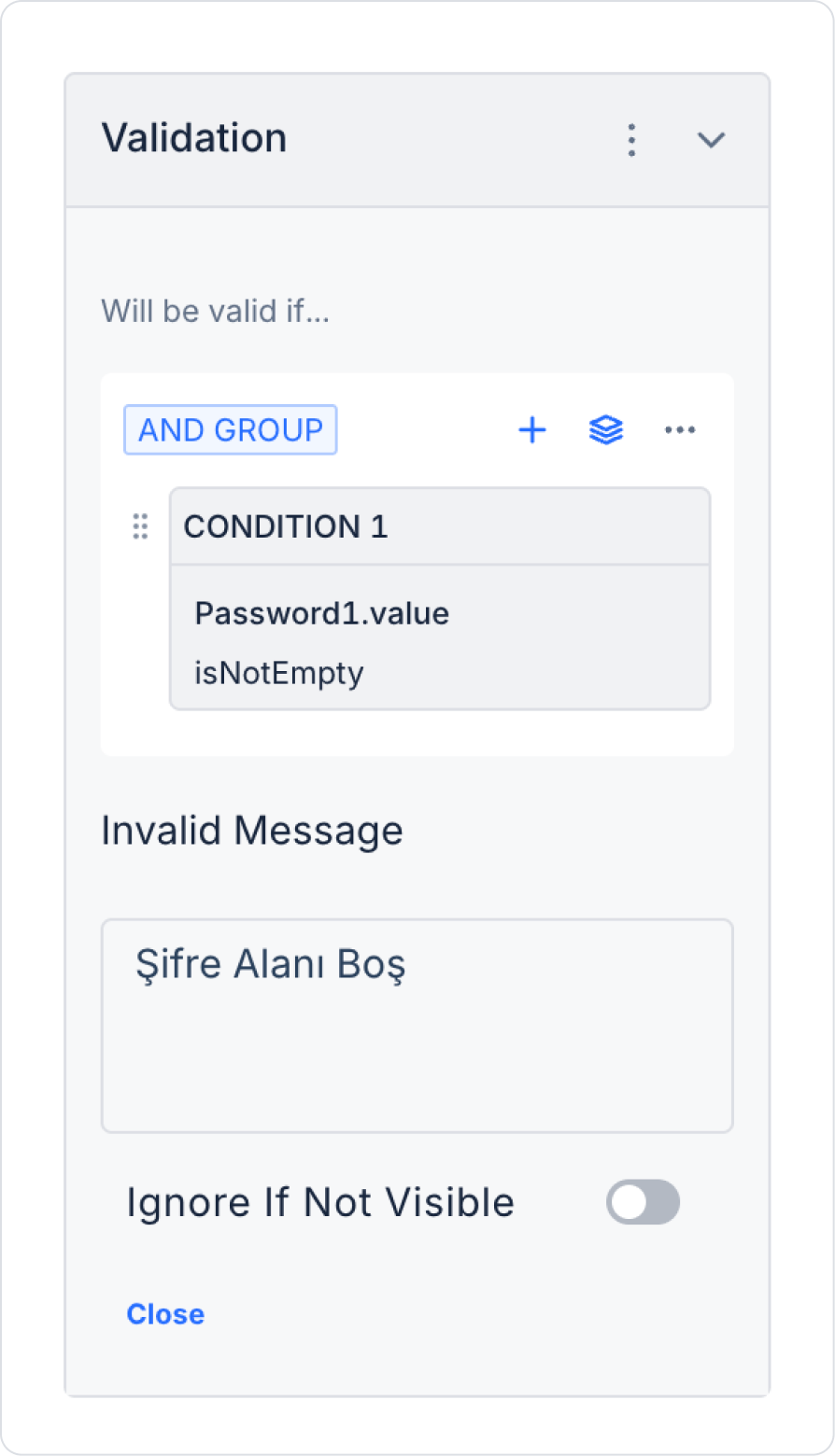 Alanın boş bırakılmaması için Password > Properties > Add Validations ekleyin. Koşul otomatik olarak tanımlı gelecektir.