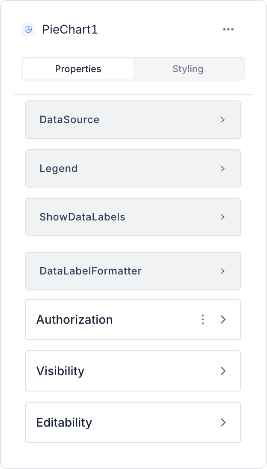 Pie Chart elementini seçtiğinizde, sağ tarafta yer alan Properties paneli üzerinden veri kaynaklarını, tooltip yapılandırmalarını, dilim renklerini ve etiket görünüm ayarlarını detaylı biçimde yapılandırabilirsiniz. Aşağıdaki tüm ayarlar madde madde açıklanmıştır.