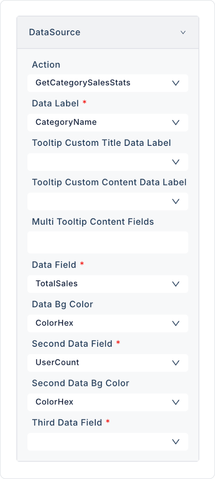 Pie Chart içerisine verileri sağlayacak PieChart > Properties > DataSource >Action > GetCategorySalesStats aksiyonunu ekleyin. Aşağıdaki tanımlamaları yapın: