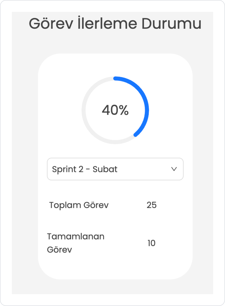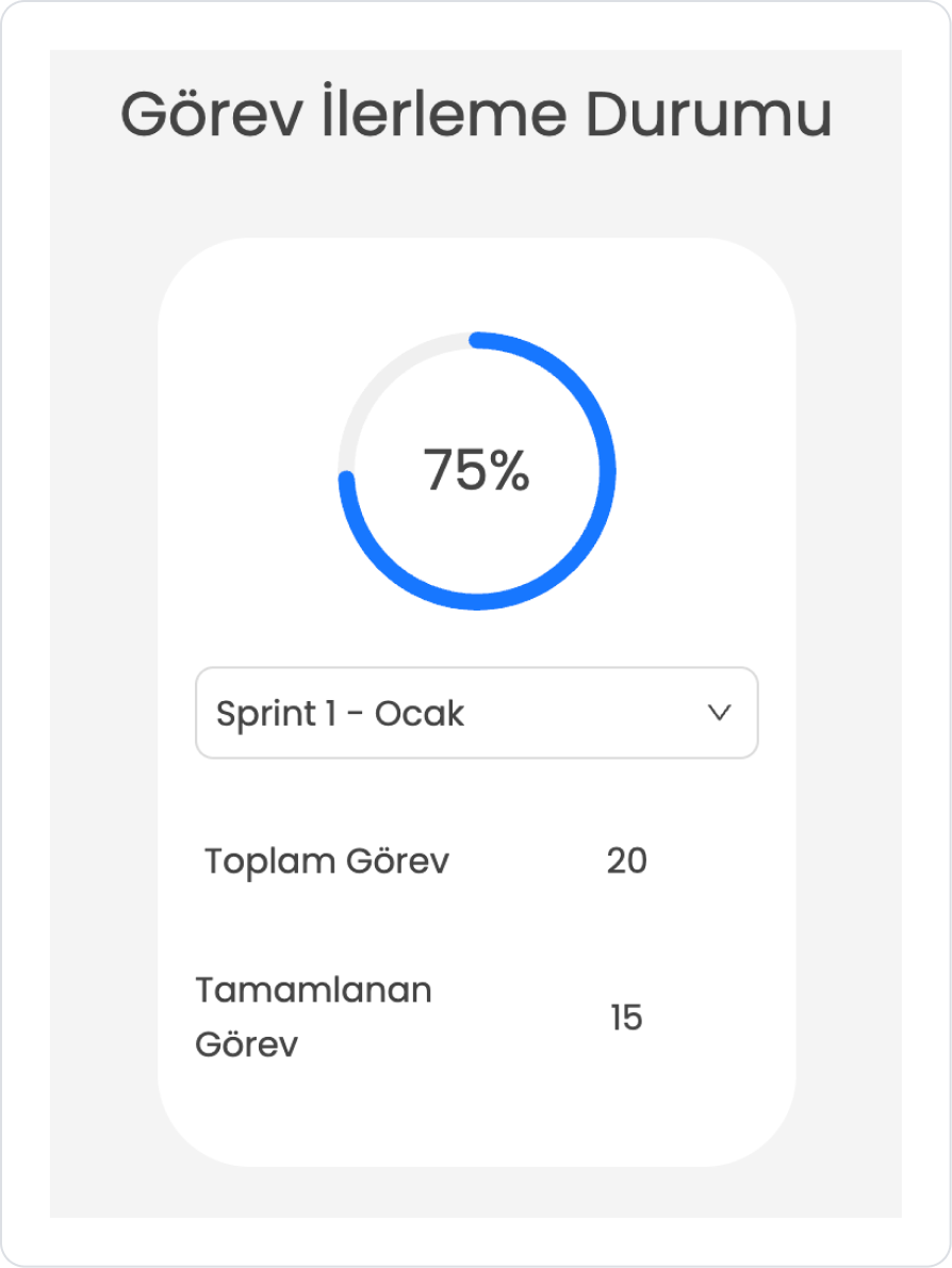 Bu değerler kullanılarak görev tamamlama oranı hesaplanır ve Progress Circle üzerinde dairesel bir ilerleme göstergesi olarak sunulur. Kullanıcı, Select Box üzerinden bir proje, sprint ya da görev grubu (ContextName) seçtiğinde ilgili kayda ait tamamlama yüzdesi Progress Circle içinde otomatik olarak güncellenir.
