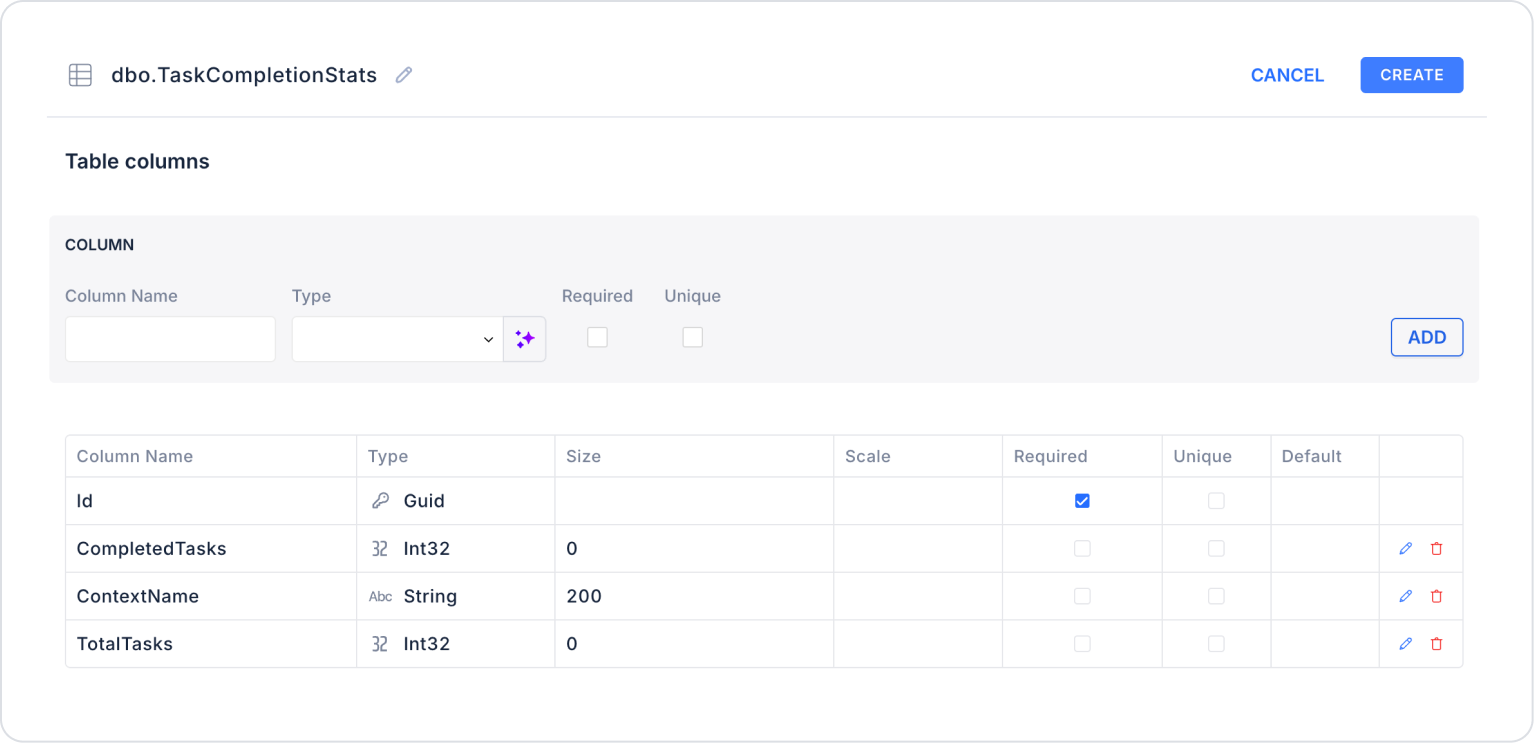 “TaskCompletionStats” adında yeni tablo oluşturun.