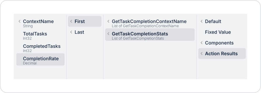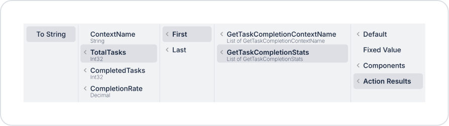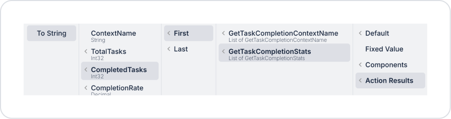 Yüzdelik bilgisini ProgressCircle > Properties > Percent > Action Result > GetTaskCompletionStats > First > CompletionRate değerini ekleyin.