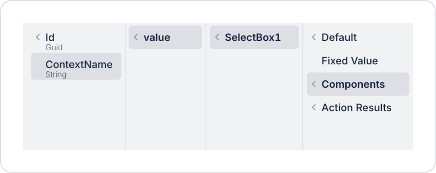 Benzer şekilde ön değeri gösterebilmek için SelectBox > Properties > Placeholder alanına önceki adımdaki gibi ContextName aksiyon sonucunu tanımlayın.