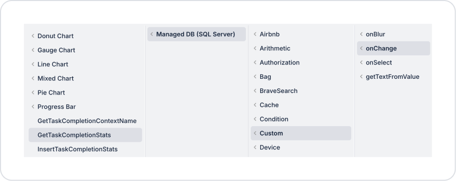 Select Box seçim bilgilerinin getirilmesi için SelectBox > Add Actions > onChange > Custom > Managed DB > GetTaskCompletionStats tanımlamasını yapın.