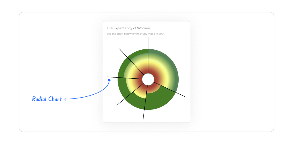 Radial Chart elementi, verilerin dairesel bir eksen üzerinde görselleştirilmesini sağlayarak özellikle oran, performans ve karşılaştırma odaklı analizlerde etkili bir gösterim sunar. Kategorilerin radyal eksen boyunca yerleştirilmesiyle her bir kategoriye ait değer, çemberin dışına doğru uzanan bir bar/dilim formunda temsil edilir. Bu yapı sayesinde kullanıcılar, veri setindeki farklı kategoriler arasındaki ilişkileri, oranları ve sıralamaları hızlıca yorumlayabilir.