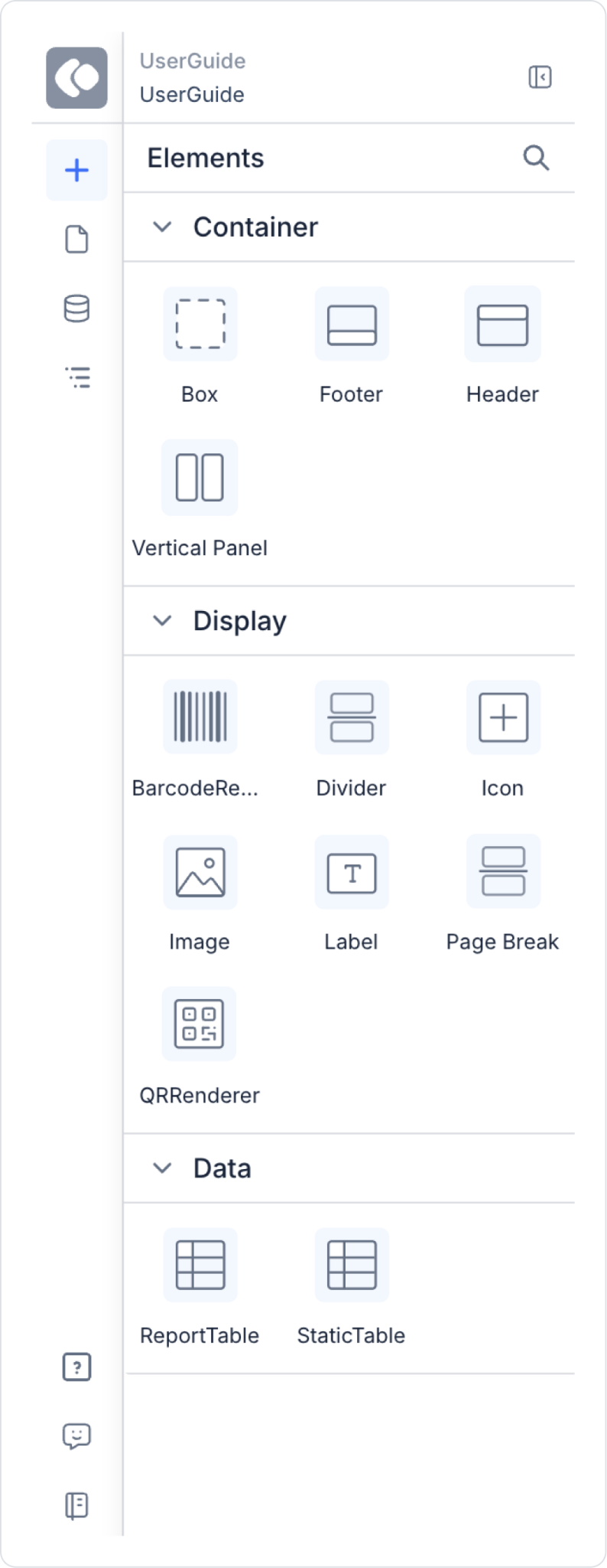 Canvas’ın sol tarafında yer alan Elements Paneli, farklı öğeleri ekleyerek raporlarınızı zenginleştirmenizi sağlar: