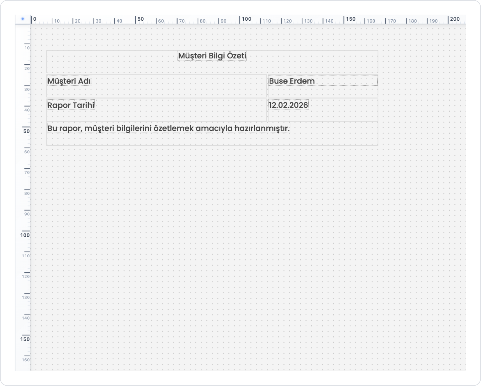 Bir raporun ilk sayfasında, baskıya uygun ve düzeni tamamen kontrol edilebilir bir müşteri bilgi özeti alanı oluşturmak.