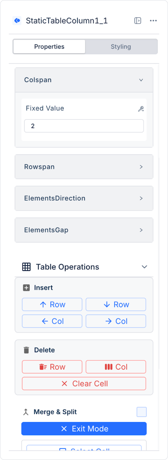 Static Table’da bir kolon seçildiğinde, o kolona ait ayarlar Properties Paneli üzerinden yönetilir. Kolonun hem yapısal hem de görsel davranışı kontrol edilebilir.