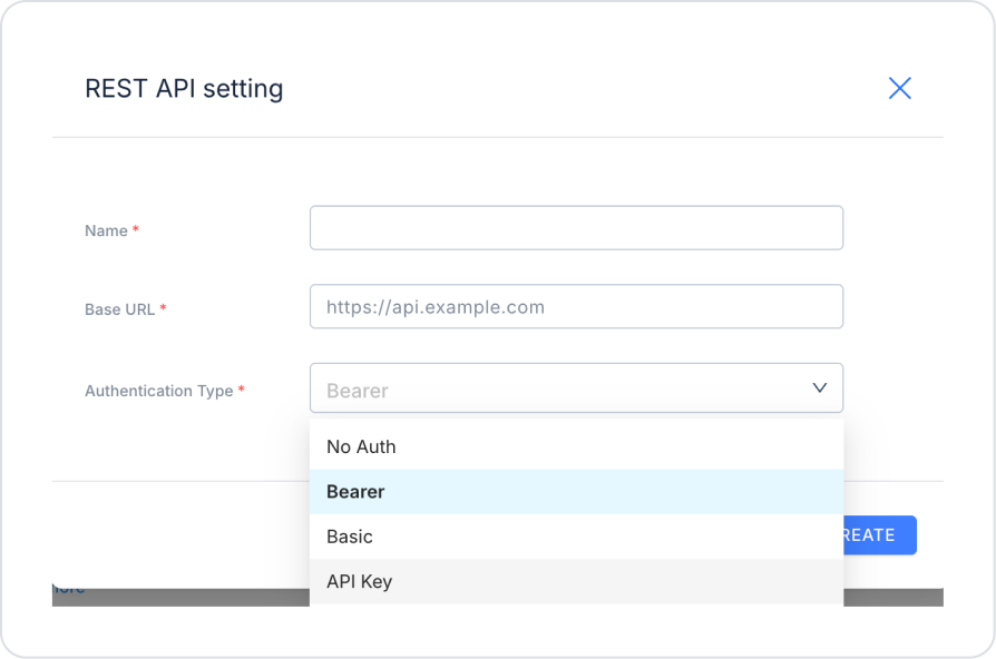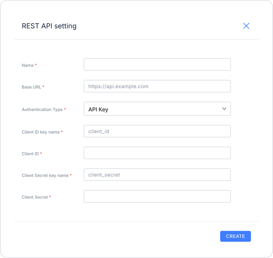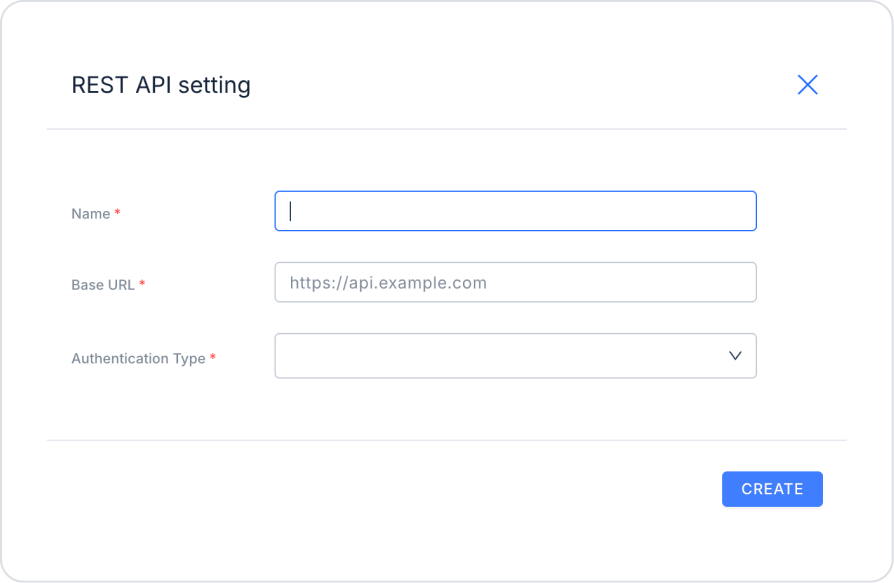 REST API Settings, uygulamanızın harici REST servisleriyle güvenli ve merkezi bir şekilde iletişim kurmasını sağlar. Bu ayarlar üzerinden API’ye ait temel bağlantı bilgileri ve kimlik doğrulama (authentication) yöntemleri tanımlanır. Tanımlanan REST API ayarları, sistem aksiyonları ve entegrasyon senaryolarında tekrar kullanılabilir.
