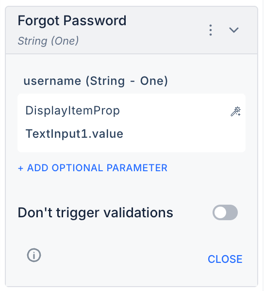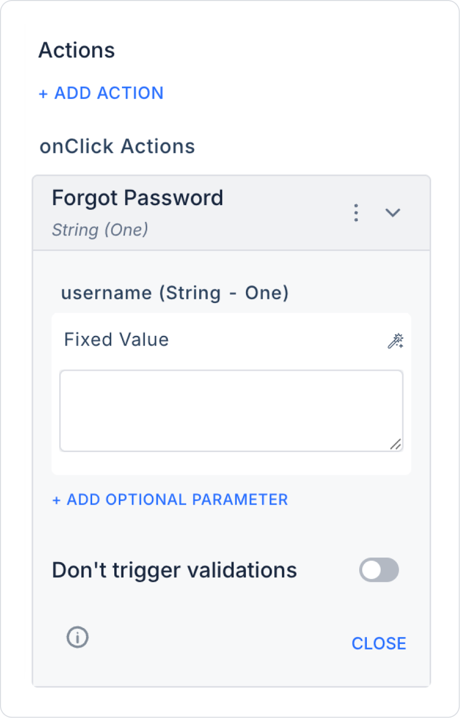 UI Design modülünde sayfadaki button elementine tıklayın. Element içerisine Button > Properties > Add Action > onClick > Authorization > Forgot Password hazır sistem aksiyonunu ekleyin.