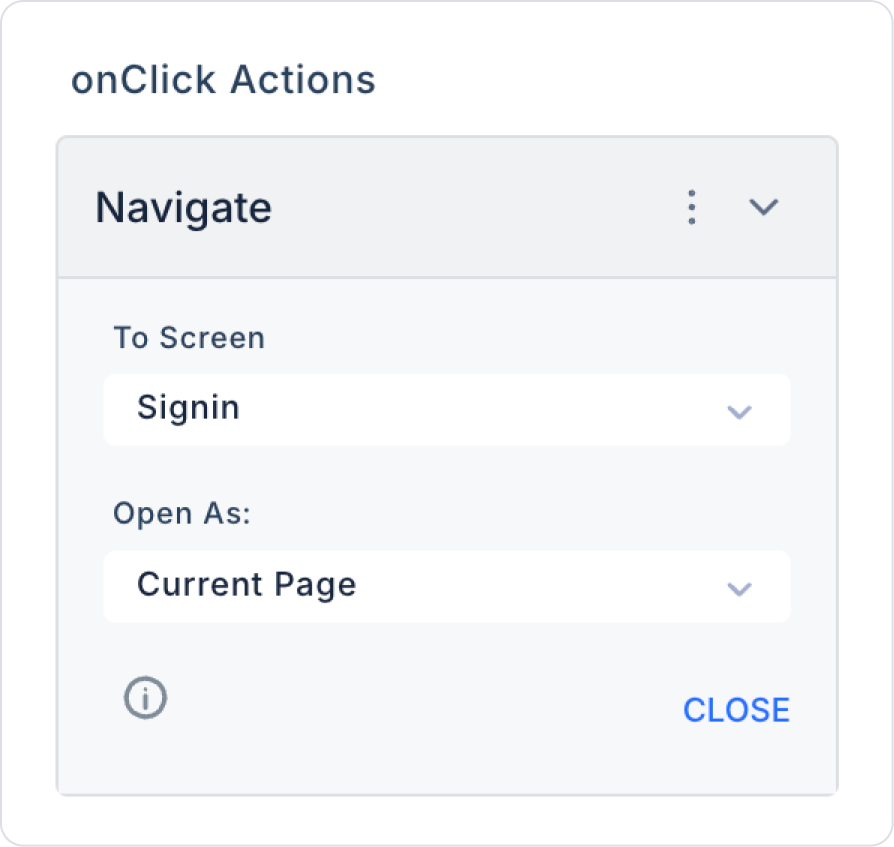Navigate aksiyonu içerisindeki To Screen alanında hazır tanımlı bulunan ‘Signin’ sayfasını seçin.